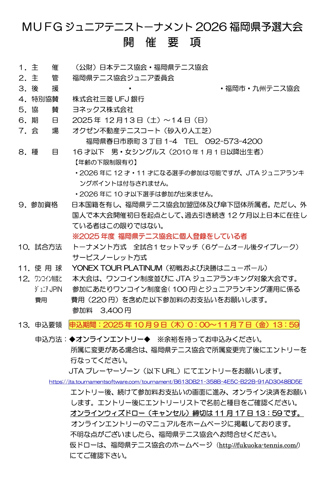 MUFGジュニアテニストーナメント2026 福岡県予選大会