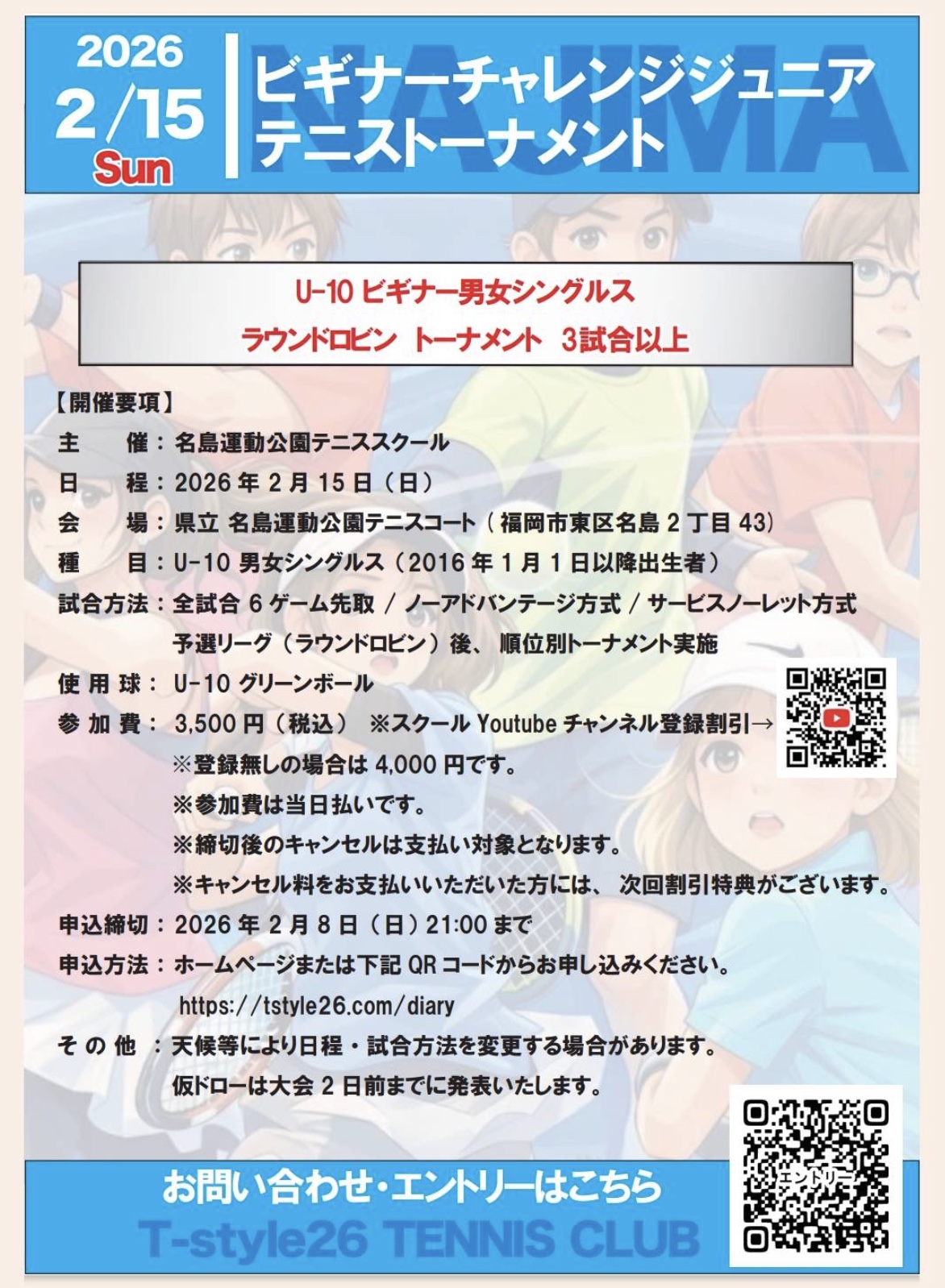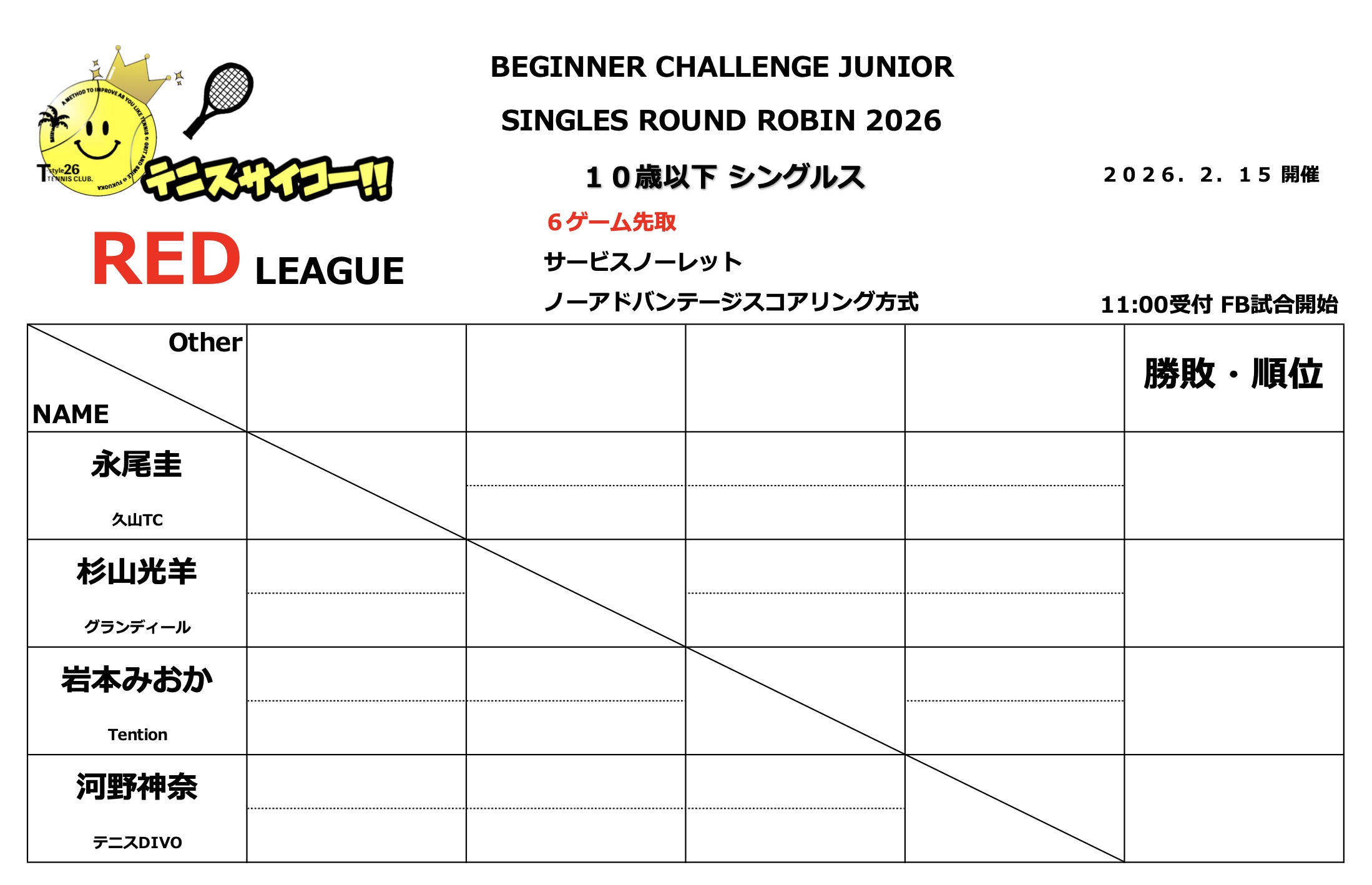 2026年 2/15㈰ビギナーチャレンジジュニアテニストーナメント🎾リーグ表