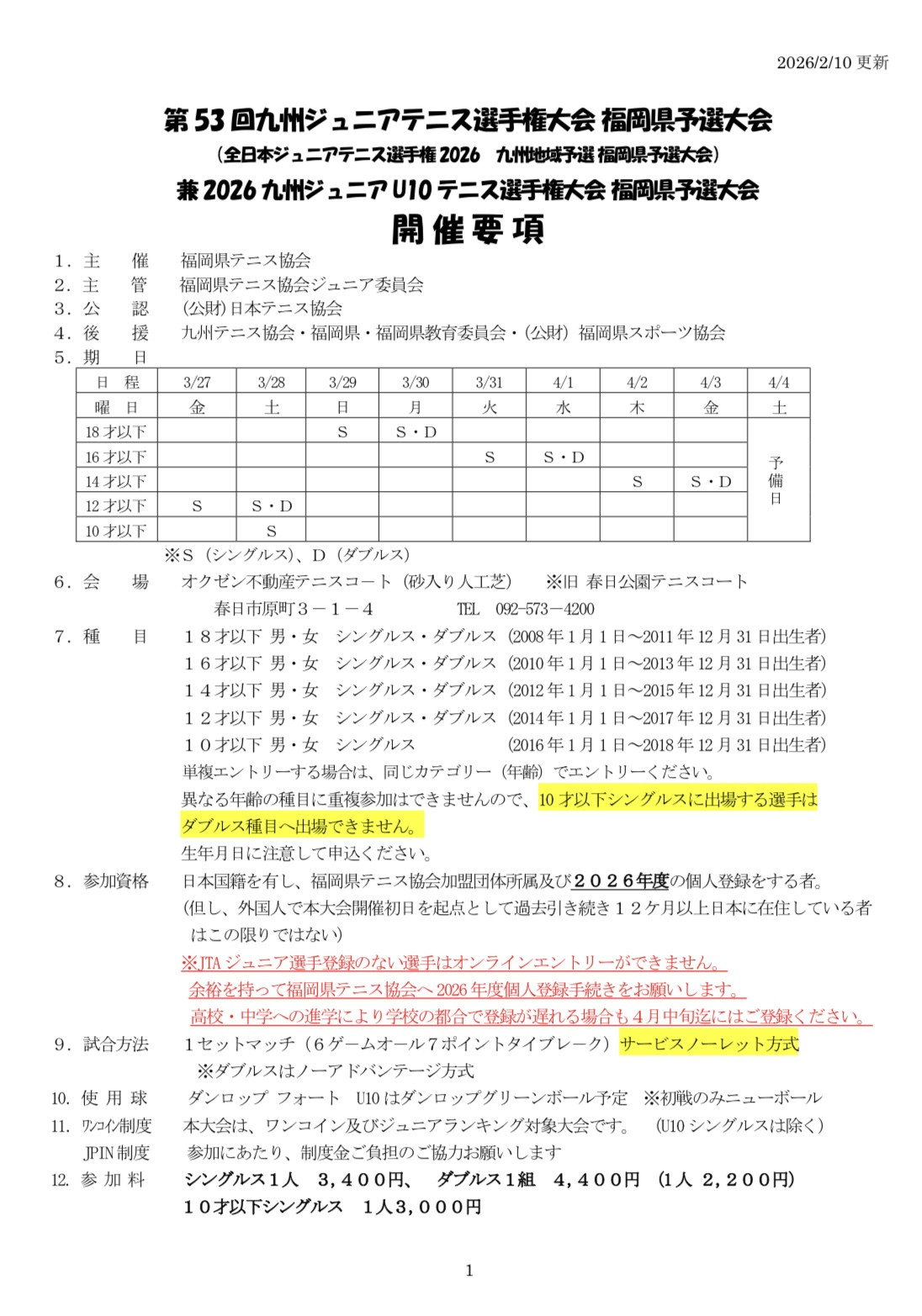 第53回 九州ジュニアテニス選手権大会 福岡県予選大会 兼2026九州ジュニアU10テニス選手権大会 福岡県予選大会