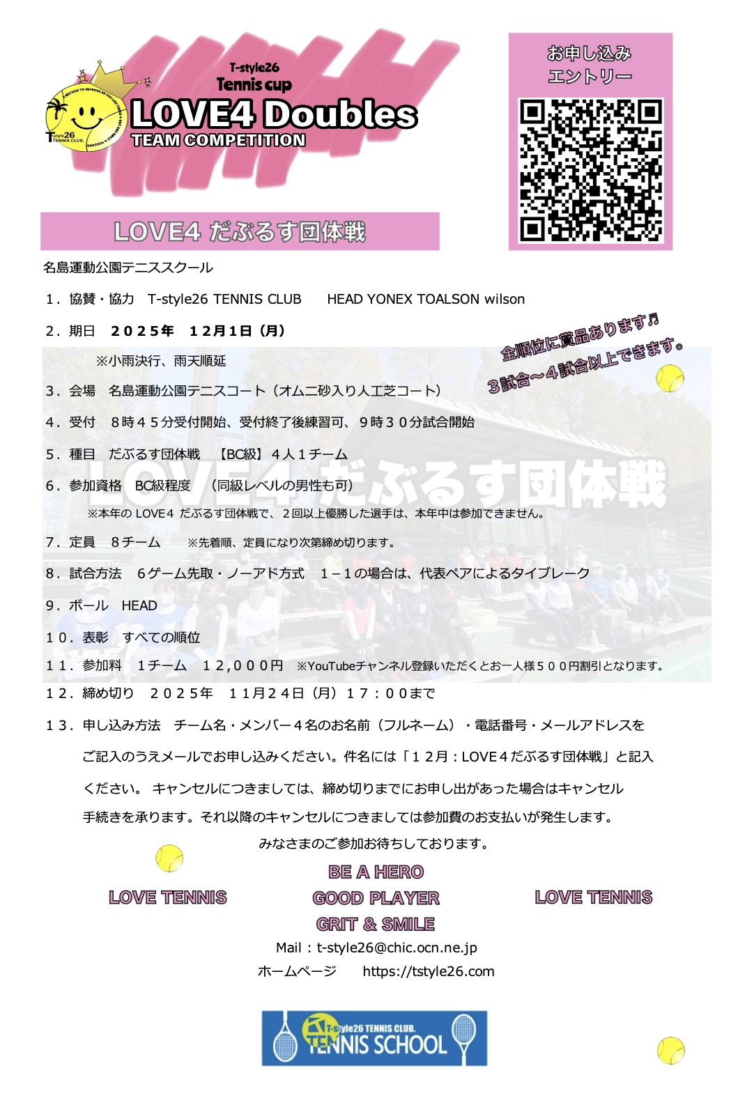 LOVE4 だぶるす団体戦 期日:2025年12月1日(月) 会場:名島運動公園テニスコート 受付:8時45分受付、9時30分試合開始 種目:ダブルス団体戦(BC級) 定員:8チーム 申込方法:下記のメールアドレスかご予約から メール:t-style26@chic.ocn.ne.jp