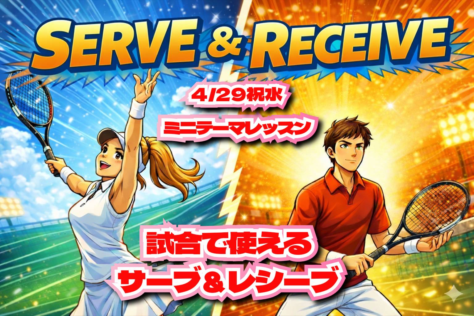 「4/29祝水 9-13時 たけしコーチのミニテーマレッスン【試合で使えるサーブとレシーブ】」
